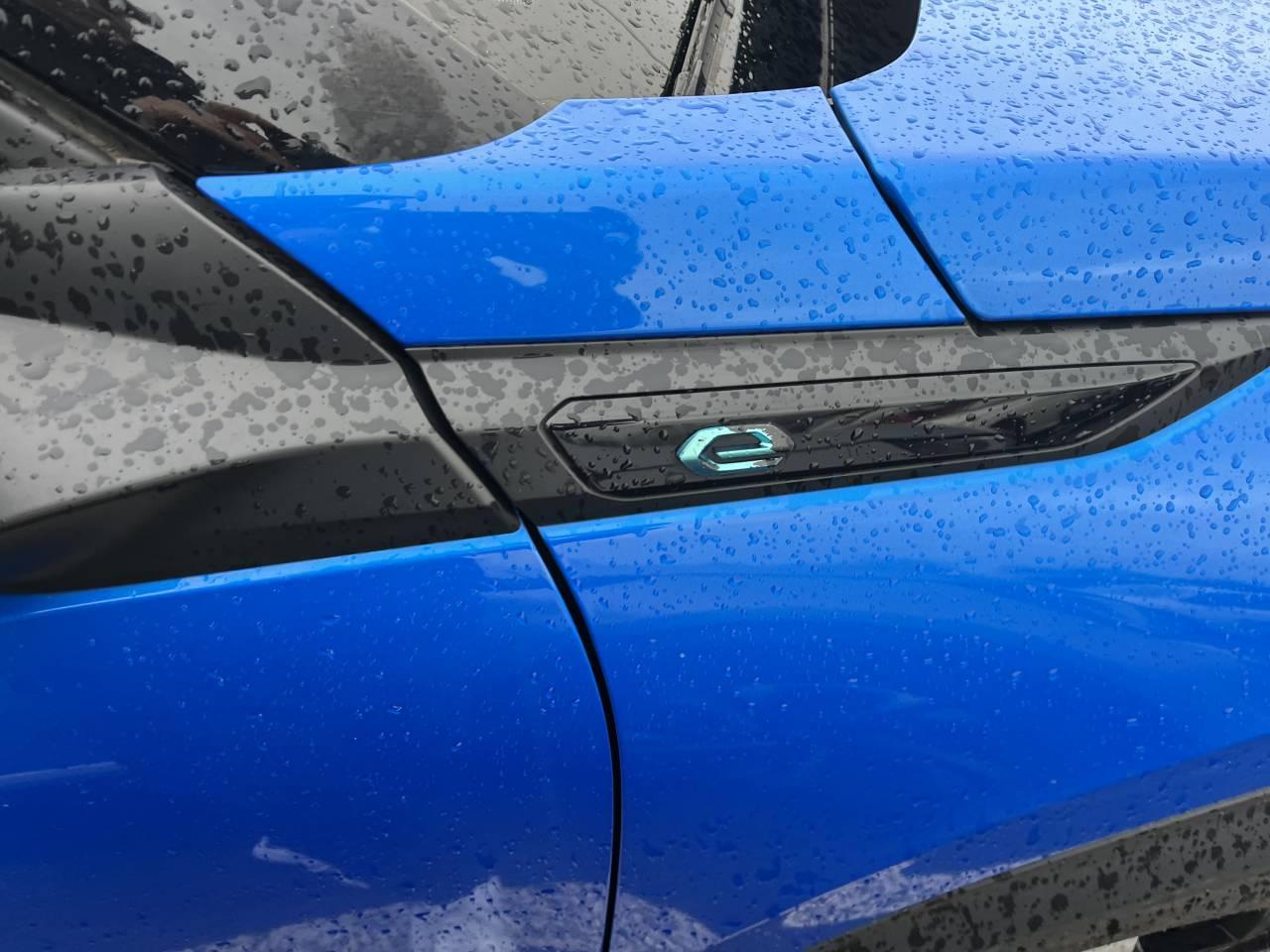 Volant compact cuir fleur avec laçage vert, Lion chromé et badge GT et commandes multimédia sur volant