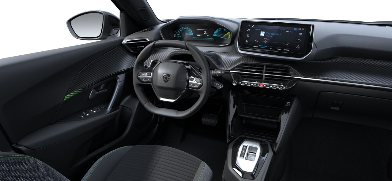 Eléments de style intérieure Planche de bord moussée avec décor Carbone et baguette Noir brillante avec jonc chromé, Panneaux de portes AV avec décor Carbone et baguette Noir brillante avec tampographie Vert Calcite, Panneaux de portes AR avec gr...